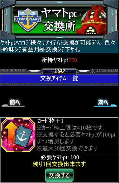 艦隊バトルで獲得したヤマトptをカードやアイテムなどに交換できる場所です。